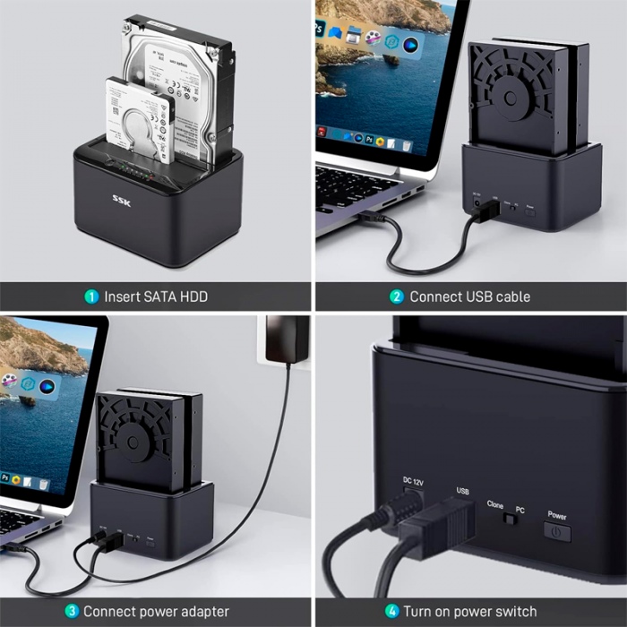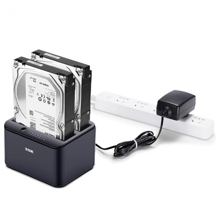 CLONADOR/DUPLICADOR SIN CONEXIÓN E INDICADOR LED INTEGRAL: EL CLONADOR DE DISCOS DUROS SSK PUEDE ADMITIR 2 DISCOS DUROS SSD HDD DE 20TB SIMULTÁNEAMENTE PARA HDD/SSD SATA I/II/III DE 2.5 / 3.5 PULGADAS, QUE SE PUEDEN USAR PARA CLONAR UN DISCO DURO EXISTENTE SIN CONECTARSE A UNA COMPUTADORA. ADEMAS, EL DUPLICADOR DE DISCOS DUROS SSK ESTÁ EQUIPADO CON INDICADORES LED DE ENCENDIDO, POSICIÓN DEL DISCO Y PROGRESO PARA AYUDARLO A COMPRENDER RÁPIDAMENTE EL ESTADO DE FUNCIONAMIENTO. | ||